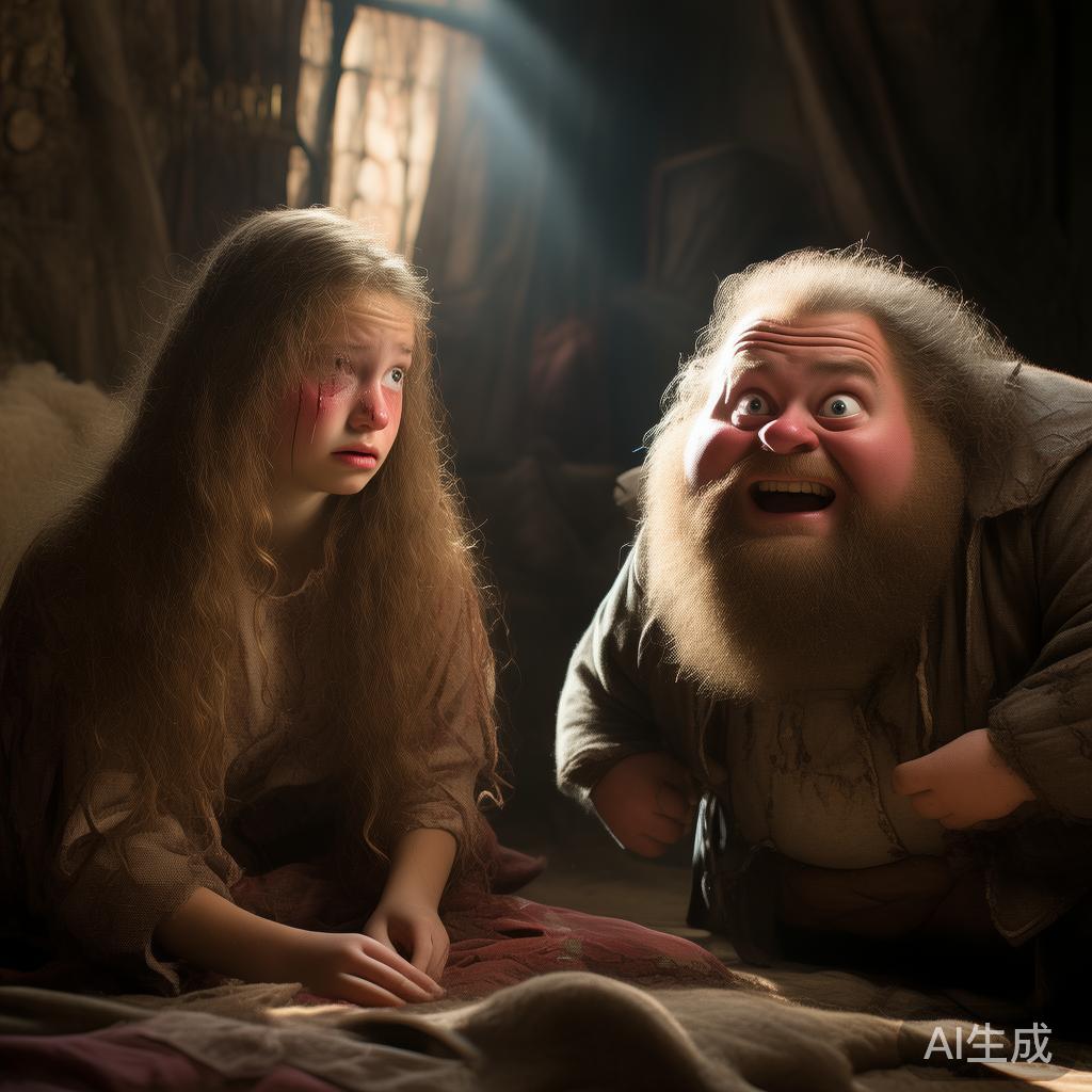 虽然姑娘拼命解释自己根本不会这种技巧,但国王根本不听,锁上门就走了,屋里只剩下她一个。那小姑娘无奈又害怕,只好坐在那里痛哭流涕。这时,突然,一个拎着步子的小矮子憨态可掬地出现在了她眼前,问她怎么这么伤心。