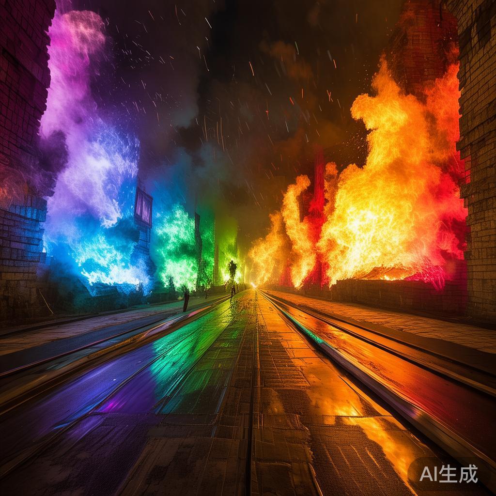 这对夫妇便在思绪的牵引下迅速飞向大城市。沿途,墙壁上燃起熊熊火焰,映出的却是七种色彩的罪孽:骄傲、贪婪、酗酒、任性——宛如一条熠熠夺目的彩虹,璀璨却冰冷无情。